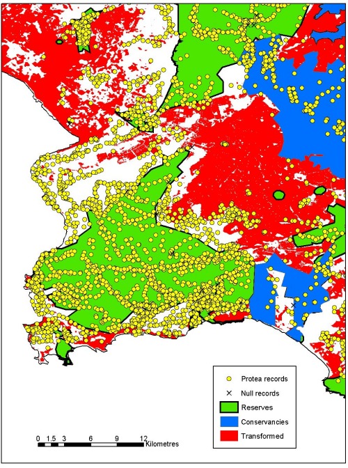 Protea Atlas Data were been used by CAPE as one of the data layers to determine a conservation network for the Fynbos Biome (using C-plan). Using predicted changes in distribution we can determine the long-term effectiveness of these options under climate change scenarios. Shown are Protea Atlas data from the Kogelberg area, showing areas under various conservation strategies and those lost due to transformation by agriculture, afforestation and urbanization.