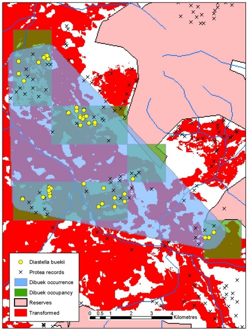 Areas of occurrence and occupancy have been worked out for all species. We are calculating areas lost to transformation. These will allow us to computationally assign New IUCN Red Data List status to proteas based on Criteria A1C (Population reduction in terms of decline in area) and B (Extent of occurrence or occupancy). Data on criteria C & D (Population size) are already in the Protea Atlas database. In conjunction with Climate Modelling we will infer E (Probability of extinction). If you want to help in evaluating these Red Data Book assessments, please email