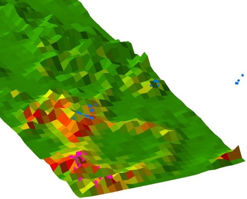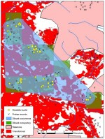 Model of predicted presence (as probabilities, red ) 0.8, green ( 0.05) of Mimetes arboreus (pink dots). Note the ghosting effect which approximates the presence of