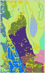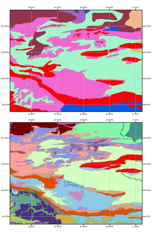 As a consequence of delimiting Fynbos boundaries more precisely, the Protea Atlas Project has also allowed the prediction of gaps in our knowledge of where Fynbos occurs. The old vegetation map (Low and Rebelo) is shown on top with the new vegetation map (in progress) shown below, for the western Little Karoo from Hex River to Garcias Pass. Some field truthing has revealed previously unsuspected range extensions in the Kango and Barrydale areas. Larger expanses of previously unsuspected Fynbos in the Touwsrivier and Anysberg Little Karoo were well atlassed during the project. On the whole though we have sampled most areas adequately. Note the detail we have been able achieve, partially due to Protea Atlas data. More null data are required though for Bayesian