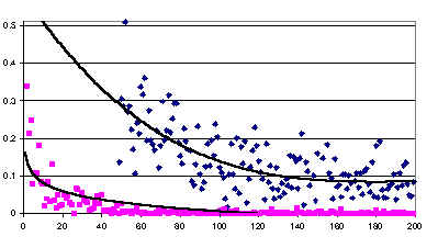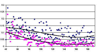 records exist (squares and bottom line). In both cases the values have declined, but show